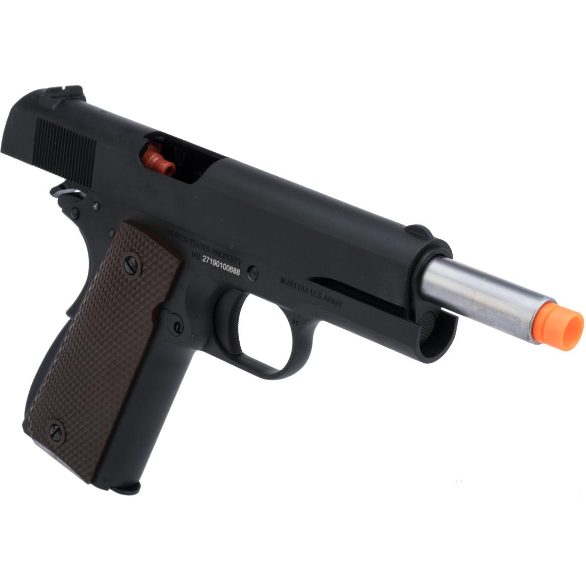 內部多處關鍵構件以金屬加強:外槍管、槍膛、反沖彈簧導桿、槍身保險裝置、滑套鎖、擊鎚與板機皆為加強金屬加工,耐用度與反覆射擊的一致性更好。真實的反沖後座力搭配模擬撞針機構,射擊時能感受到扎實而沉穩的回饋,操作手感接近真槍。