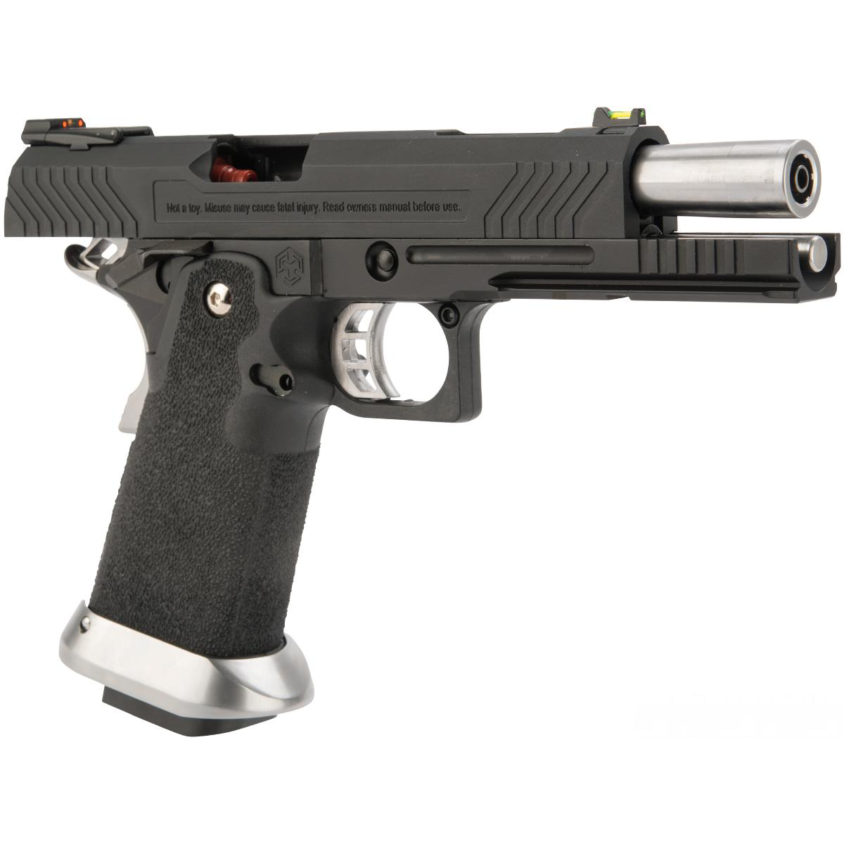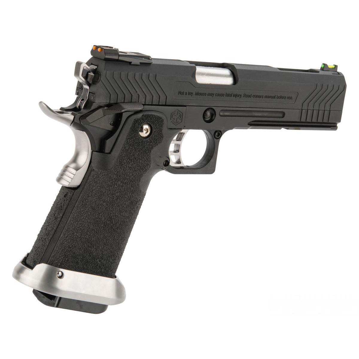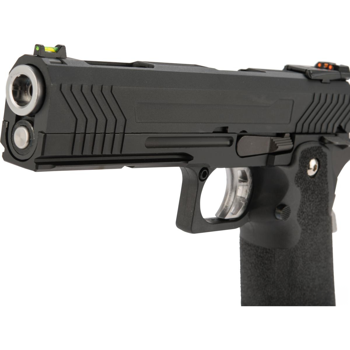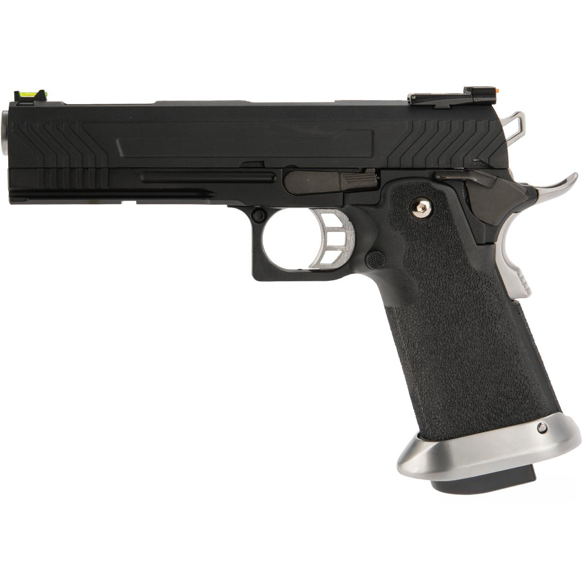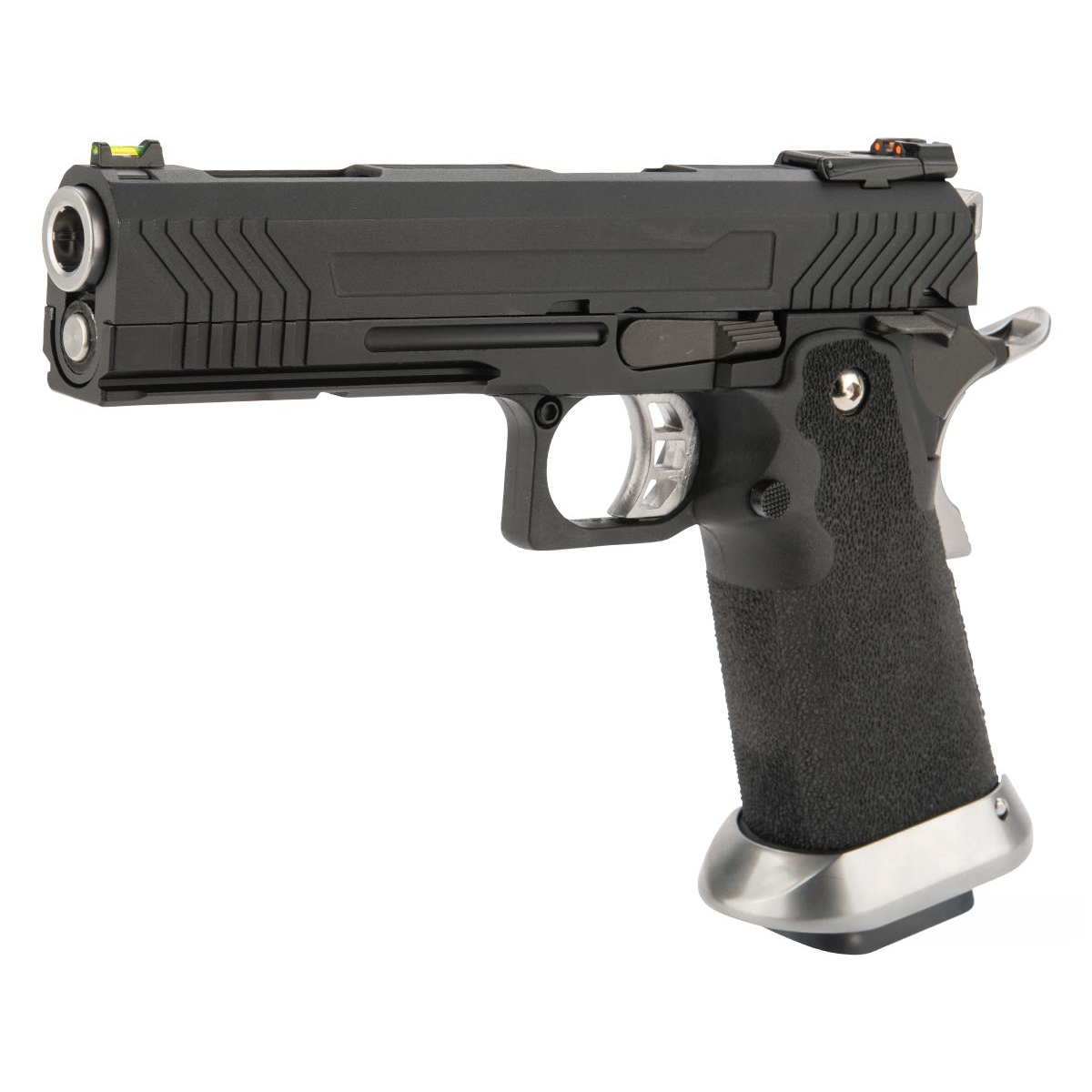 AW HX1102 全金屬 CO2 動力後座力氣槍(黑色)為 Hi-Capa 類型 氣槍,搭載全金屬滑套與上槍身,提供真實射擊手感與穩定性。加大的競技風格握把,蜂巢圖案握把設計,符合人體工學,即使長時間射擊也能保持舒適。