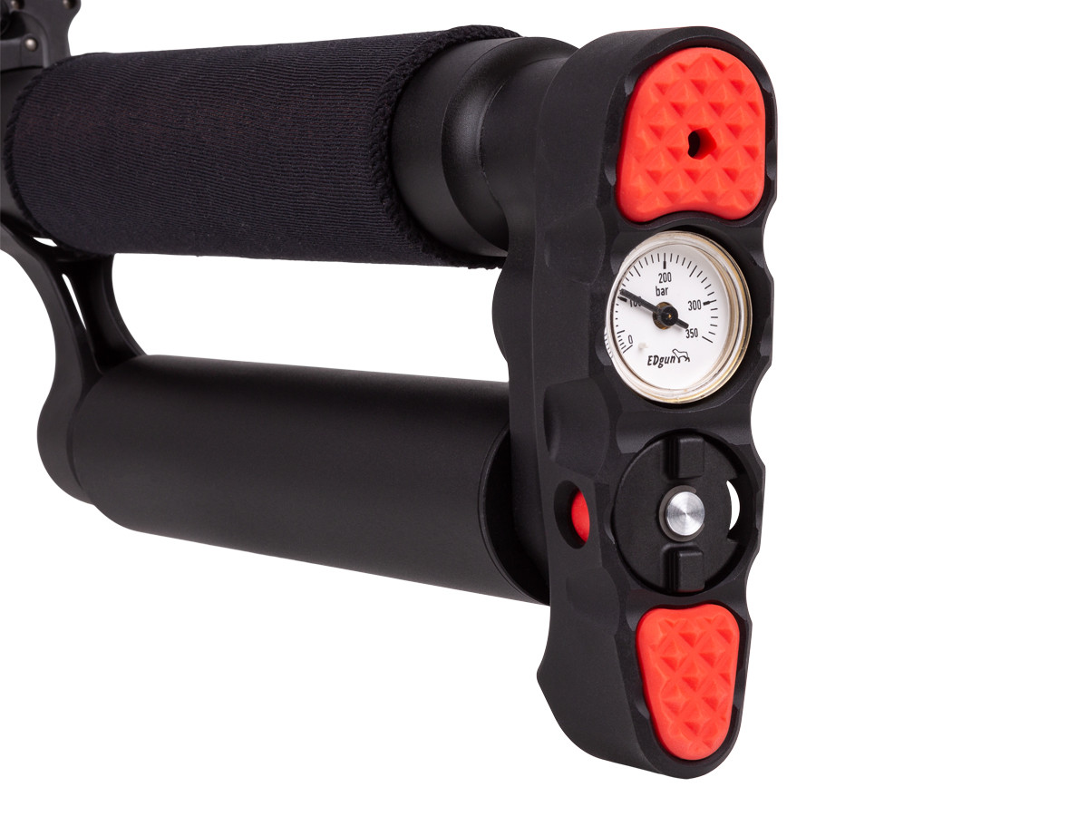 機身同樣內建 壓力表、空氣過濾器(air stripper)與消音器,採左右通用手動保險、止滑槍托紋與 QD 快拆掛點,整體設計把「大槍的能力」壓縮到「背包等級」。