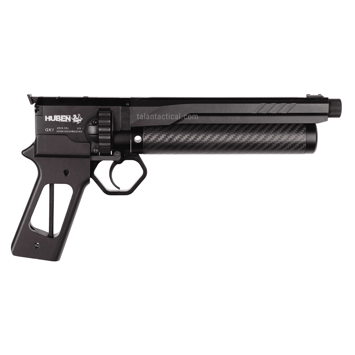 Huben GK1 手槍 在氣槍界中脫穎而出,將 K1 的極高威力和大容量彈匣優勢融入更小巧、更具多功能性的包裝中。該手槍僅重 1.2 公斤,長度為 325 毫米,具備可調功率設置、機械瞄具和可安裝光學瞄準具的導軌。其無與倫比的威力和準確度,使得其射程遠超過傳統氣槍手槍的極限。