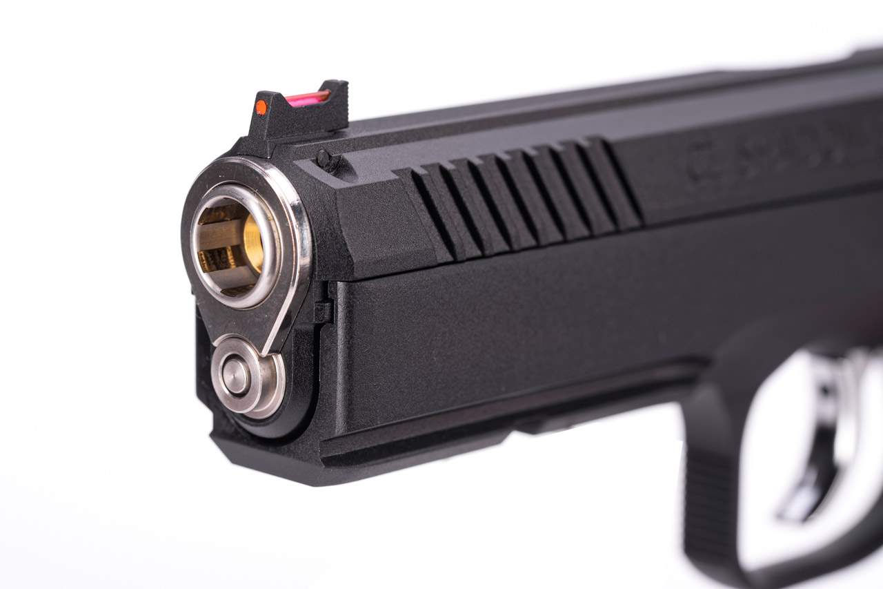 KJ CZ Shadow 2 是以 CZ Shadow 2 競技手槍為藍本的高擬真款式,採 ASG 授權 1:1 比例複製,外觀與操作細節還原度高。全金屬滑套與金屬槍身搭配 CNC 精加工,滑套上刻有 CZ SHADOW2 標記,滑套循環順暢且帶有實感的咔嗒聲,射擊手感接近實槍。