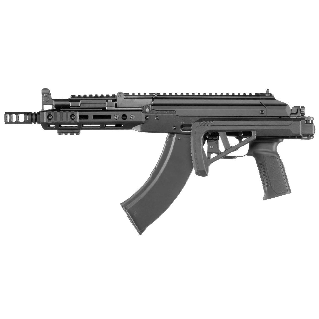 Tokyo Marui AKX GBB 是馬牌對傳統 AKM/AK47 平台的現代化改良版,把平台做成短槍管步槍(SBR),並原廠配置 Picatinny 頂軌、M-LOK 护木與折疊槍托,讓你開箱即可上場 CQB。這些原廠改良讓 AKX 能裝上手電、雷射與光學瞄具等配件,是原始 AKM 所無法直接做到的擴充性。