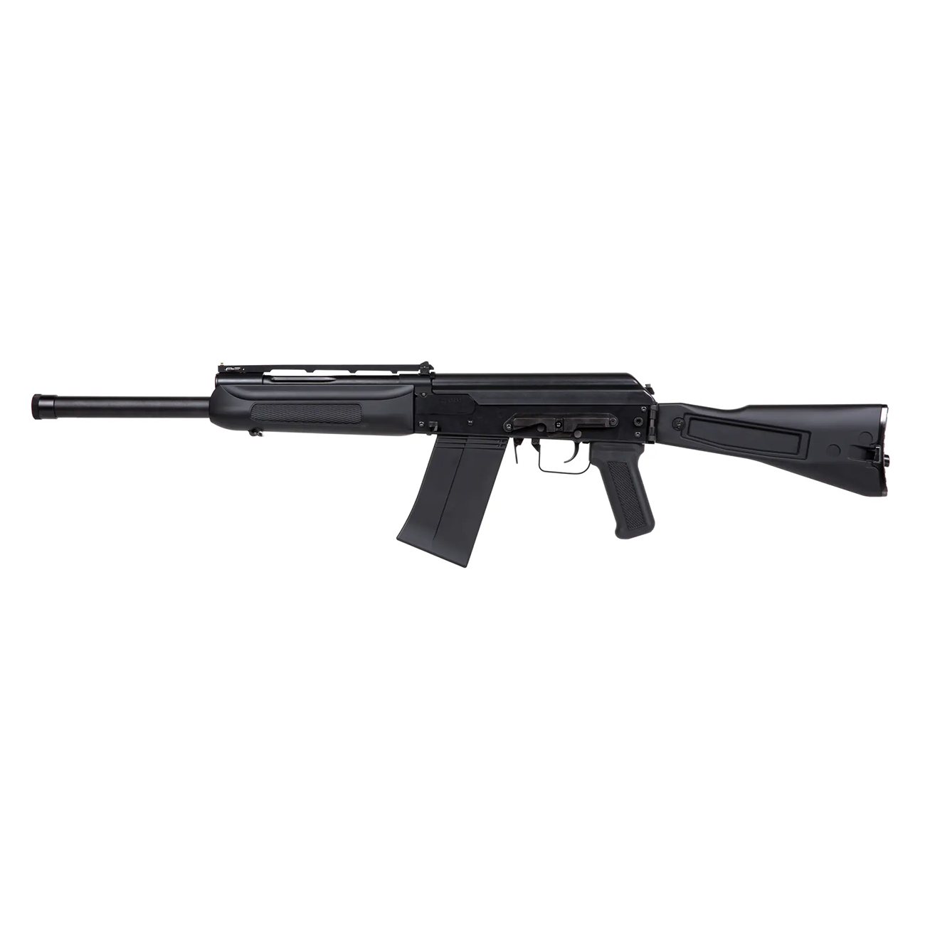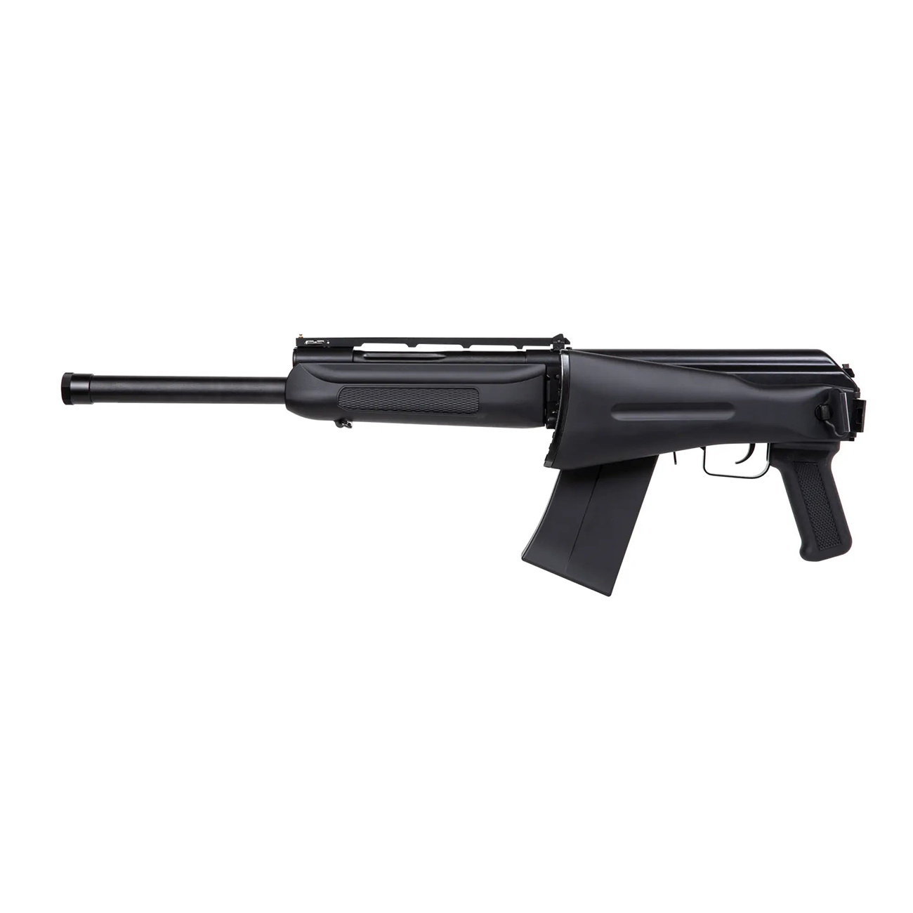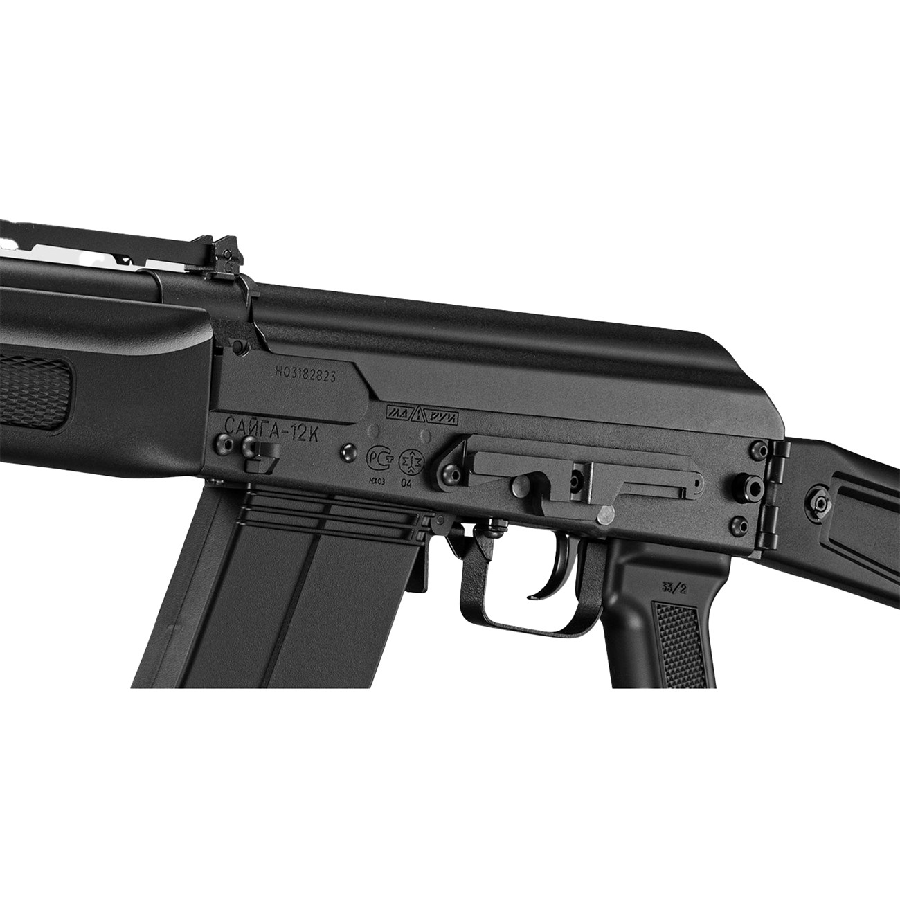 Saiga-12K 的各部零件精準依照真鐵測量數據製作,機匣蓋與選擋桿使用鋼壓機加工,提高外觀還原度。準星可調,並可透過側面魚骨導軌安裝光學瞄具,彈匣內附儲氣罐及測溫刻度,兼顧實用性與可玩性。