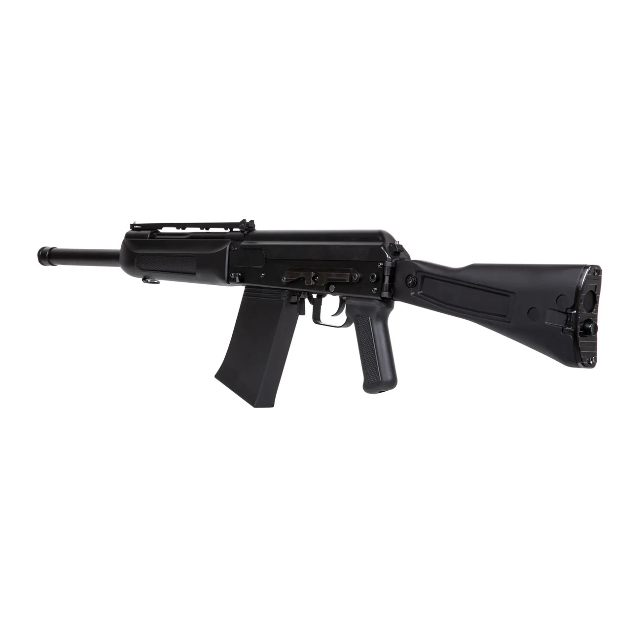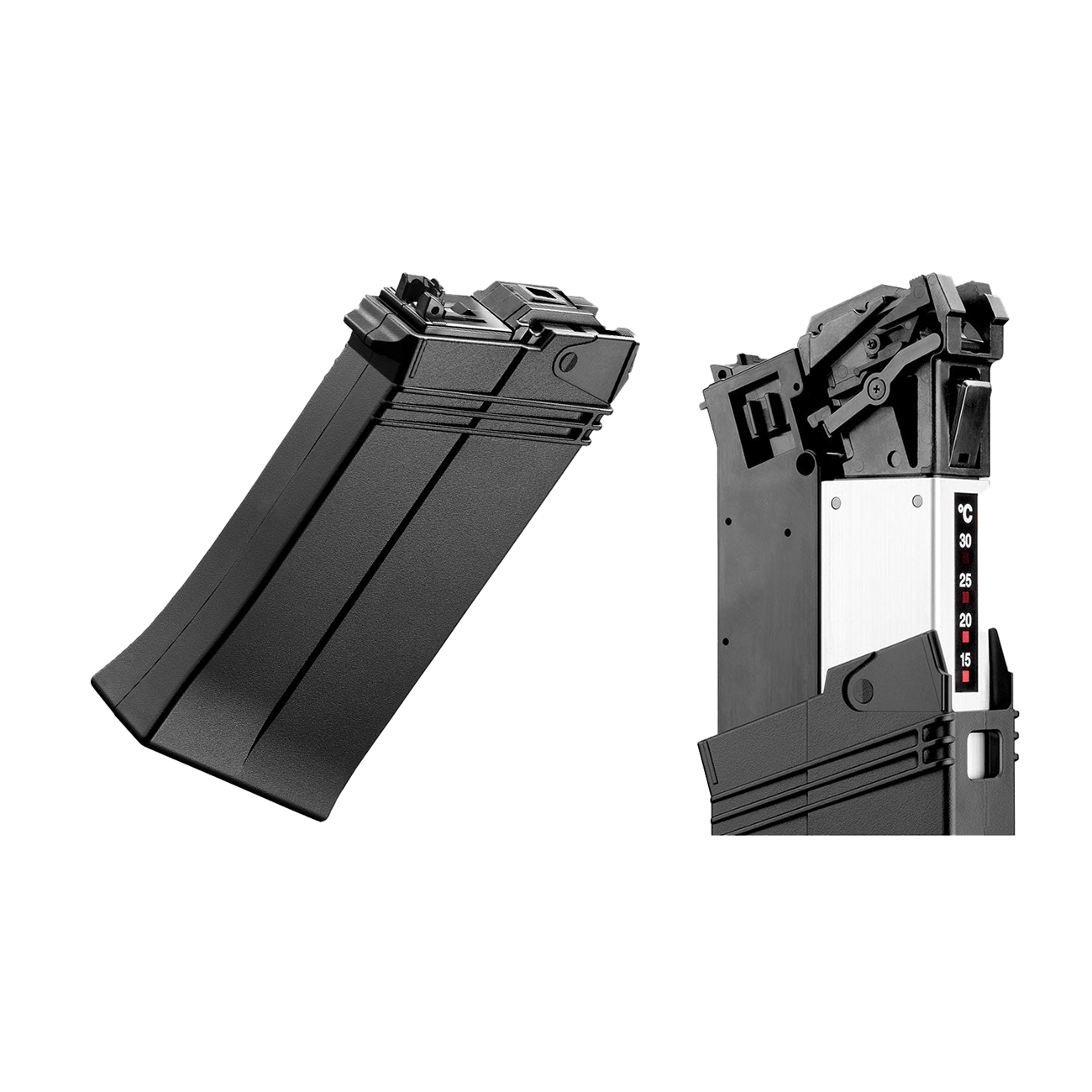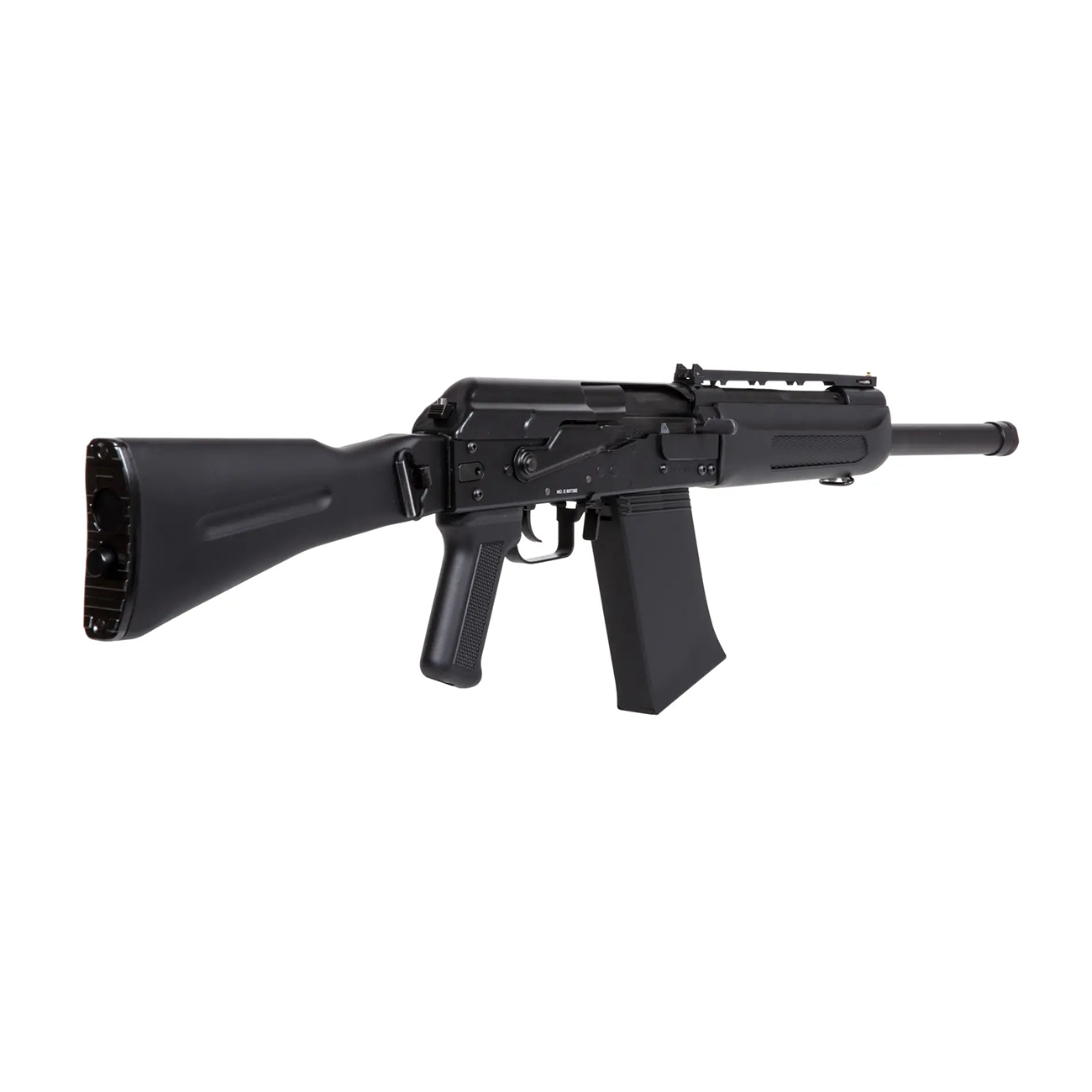 Saiga-12K 的各部零件精準依照真鐵測量數據製作,機匣蓋與選擋桿使用鋼壓機加工,提高外觀還原度。準星可調,並可透過側面魚骨導軌安裝光學瞄具,彈匣內附儲氣罐及測溫刻度,兼顧實用性與可玩性。