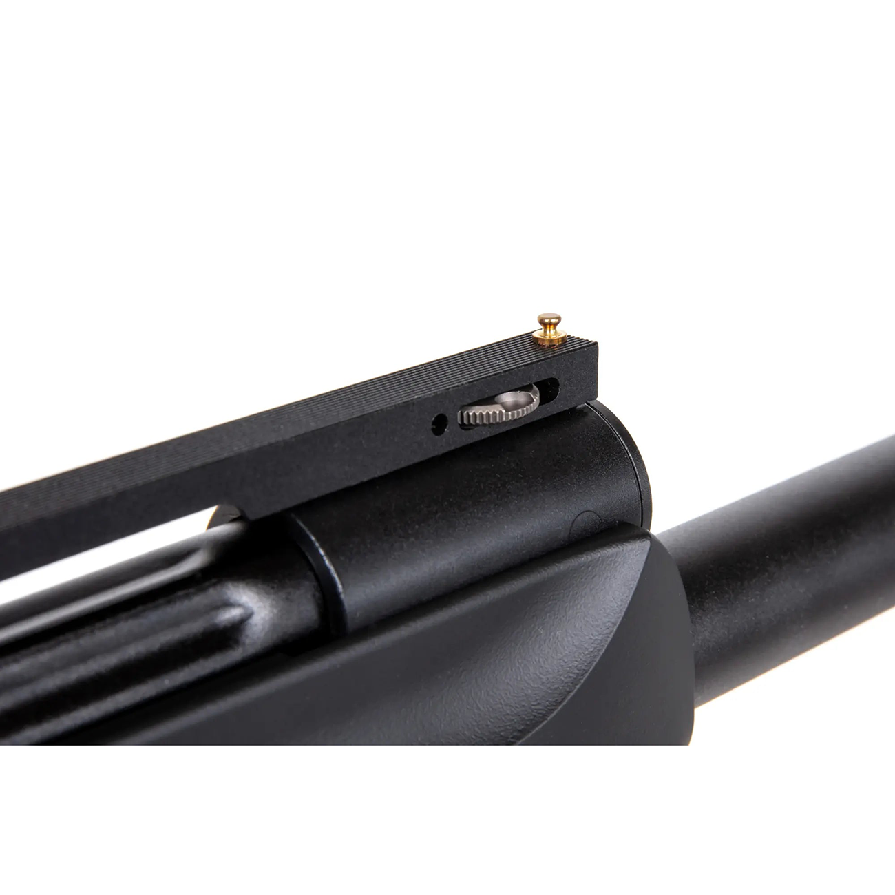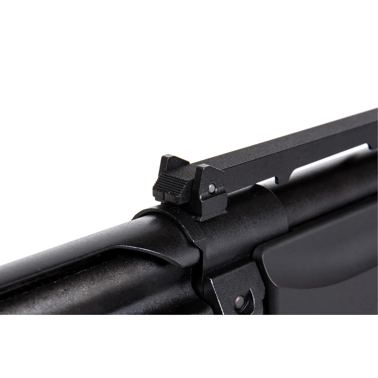 該槍一次可發射三發 BB 彈,模擬散彈槍的廣域命中效果。配備大型 19mm 活塞,槍栓連動操作,產生強烈衝擊後坐力,射擊手感逼真。內建無彈不擊發系統,可在彈匣耗盡時自動停止射擊,增強安全性與操作真實感。