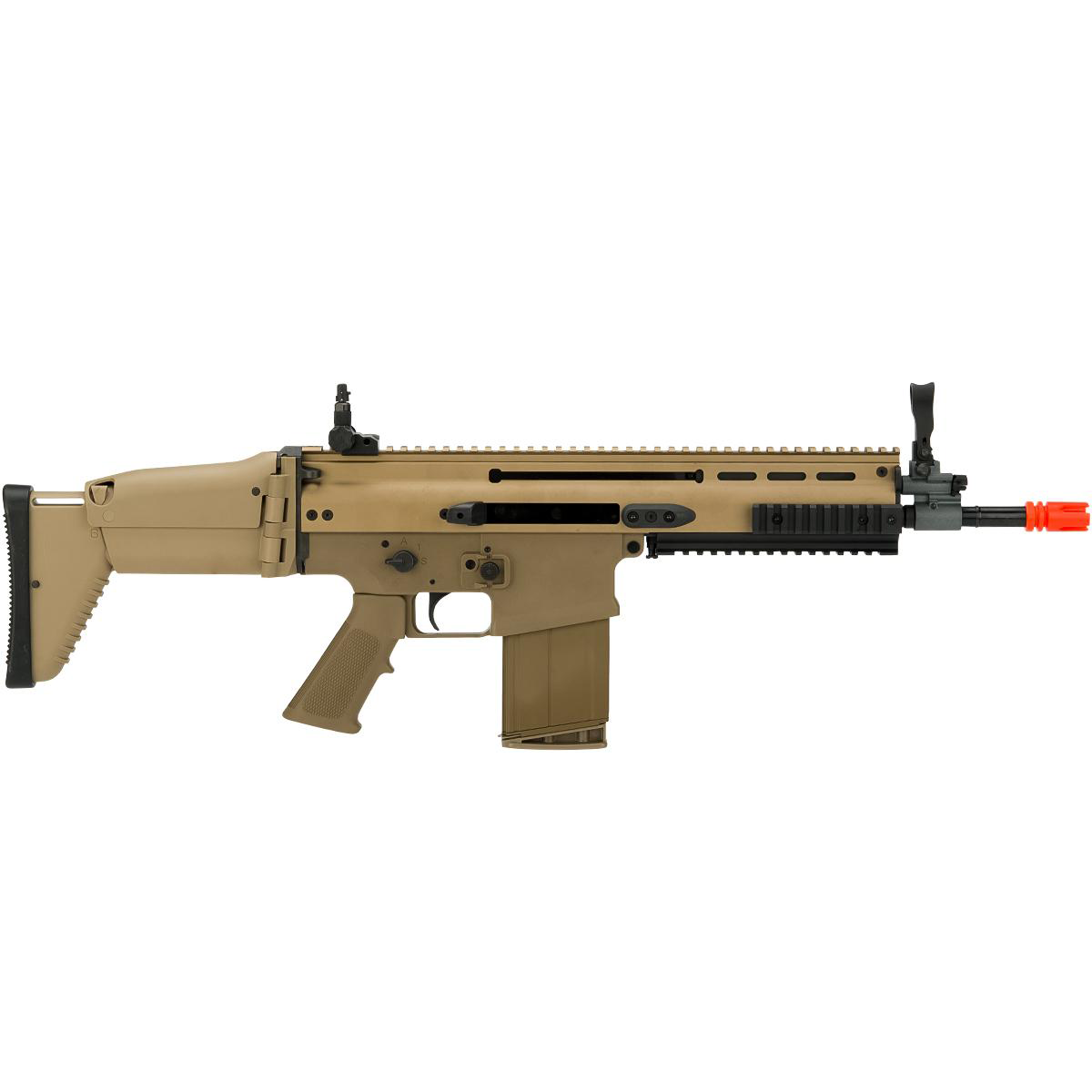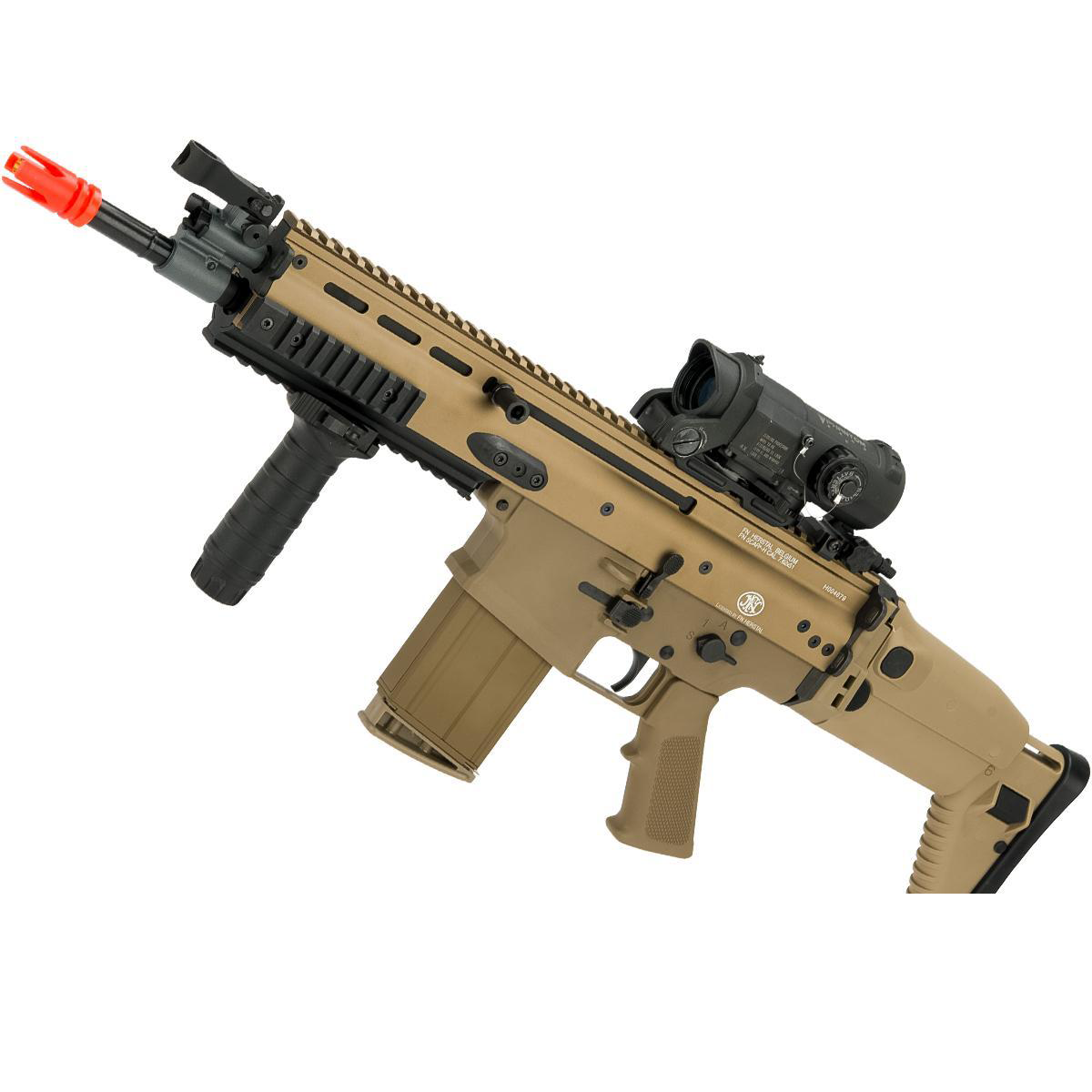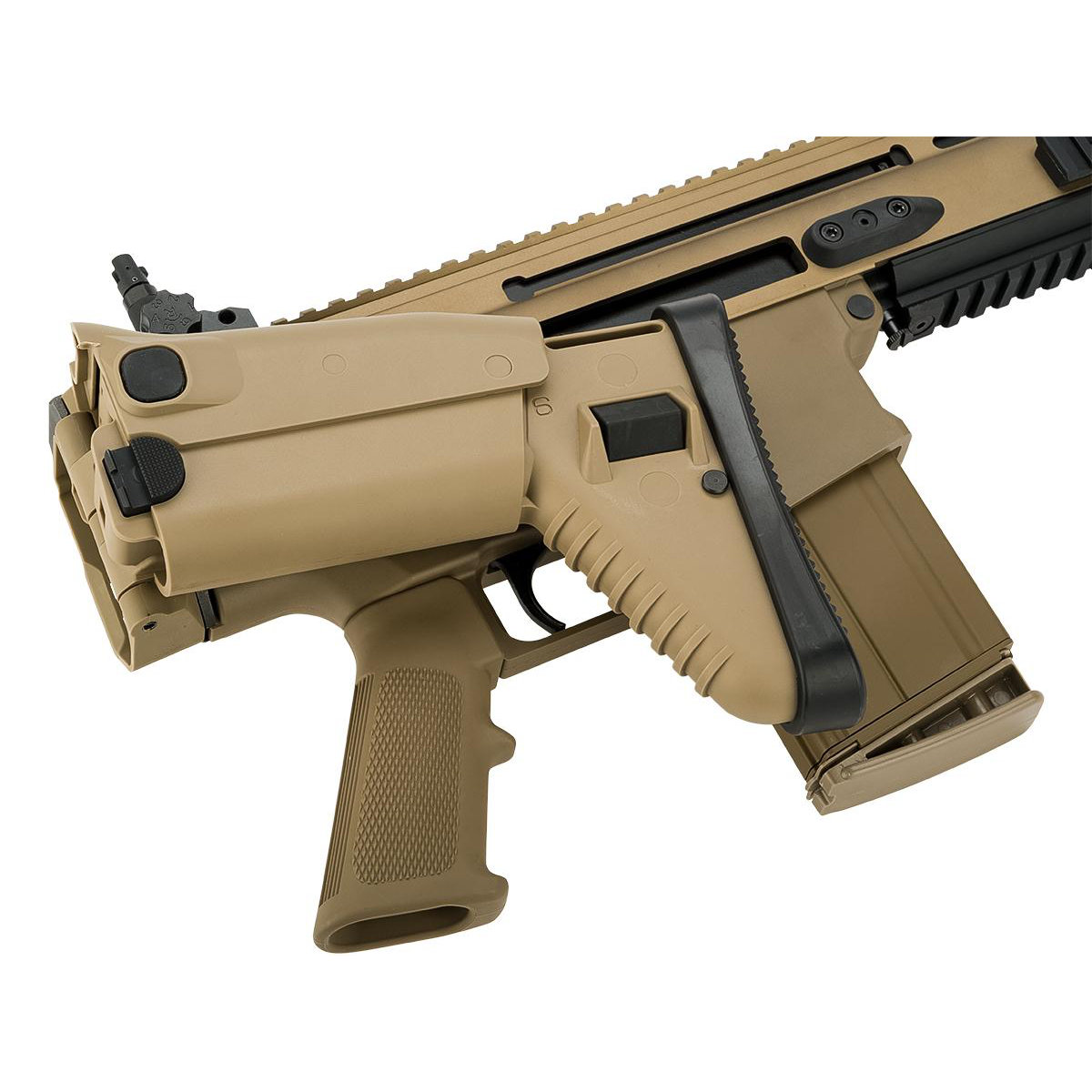 VFC SCAR-H MK17 將現代戰術步槍的剛性與瓦斯 GBBR 的擬真覆進手感結合在同一把槍上。外殼採注塑聚合物接收器以兼顧強度與重量,上機匣以 CNC 加工並配有全長 20mm 魚骨導軌,能穩固安裝各式光學與戰術附件;護木與槍托採用堅固的尼龍聚合物,後者可折疊與伸縮,方便機動部署。射擊循環提供強烈的反吹後座力,且具最後一發空倉掛機功能,操作流暢且回饋真實。
