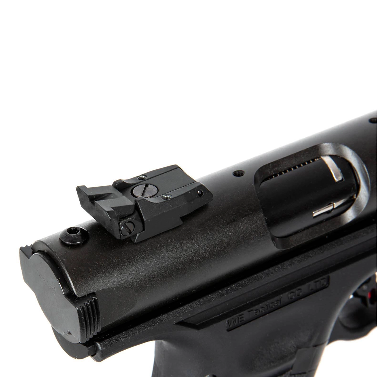 這款手槍配備了光纖前準星和可調後瞄準,為精準射擊提供支持。選擇器開關隱藏在螺栓下方,用戶需要將螺栓拉到後方才可切換射擊模式,並用手指輕鬆調整。其折疊式設計讓用戶能快速拆卸進行Hop-up調整或清潔,提升了便捷性與可操作性。