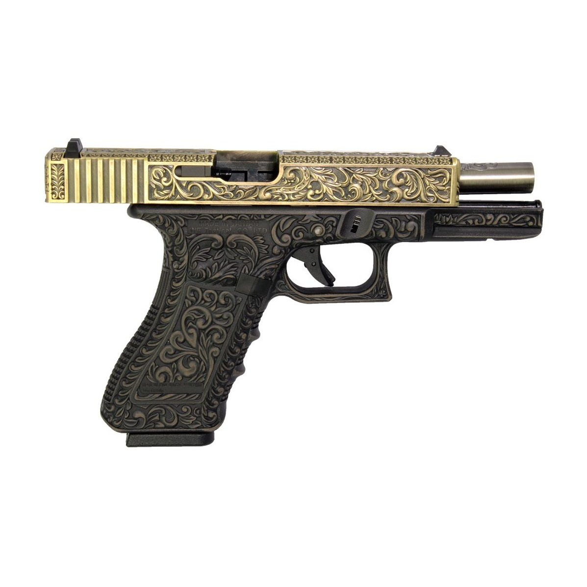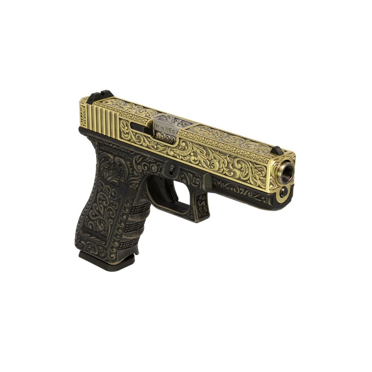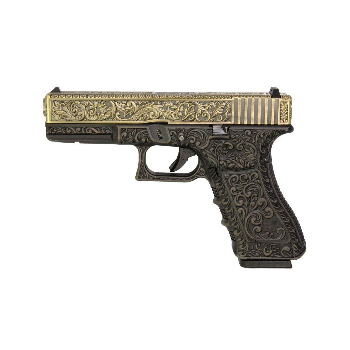 WE Glock G17 Gen3 蝕刻雕花金屬版是一款具有極高細節的氣槍手槍,完美複製了經典的 GLOCK G17 Gen3,並加入了精緻的3D雕刻技術,為手槍愛好者帶來全新的外觀與射擊體驗。金屬滑套和輕質、堅固的注塑聚合物槍身,確保了耐用性與重量的平衡,並提供優良的射擊手感。