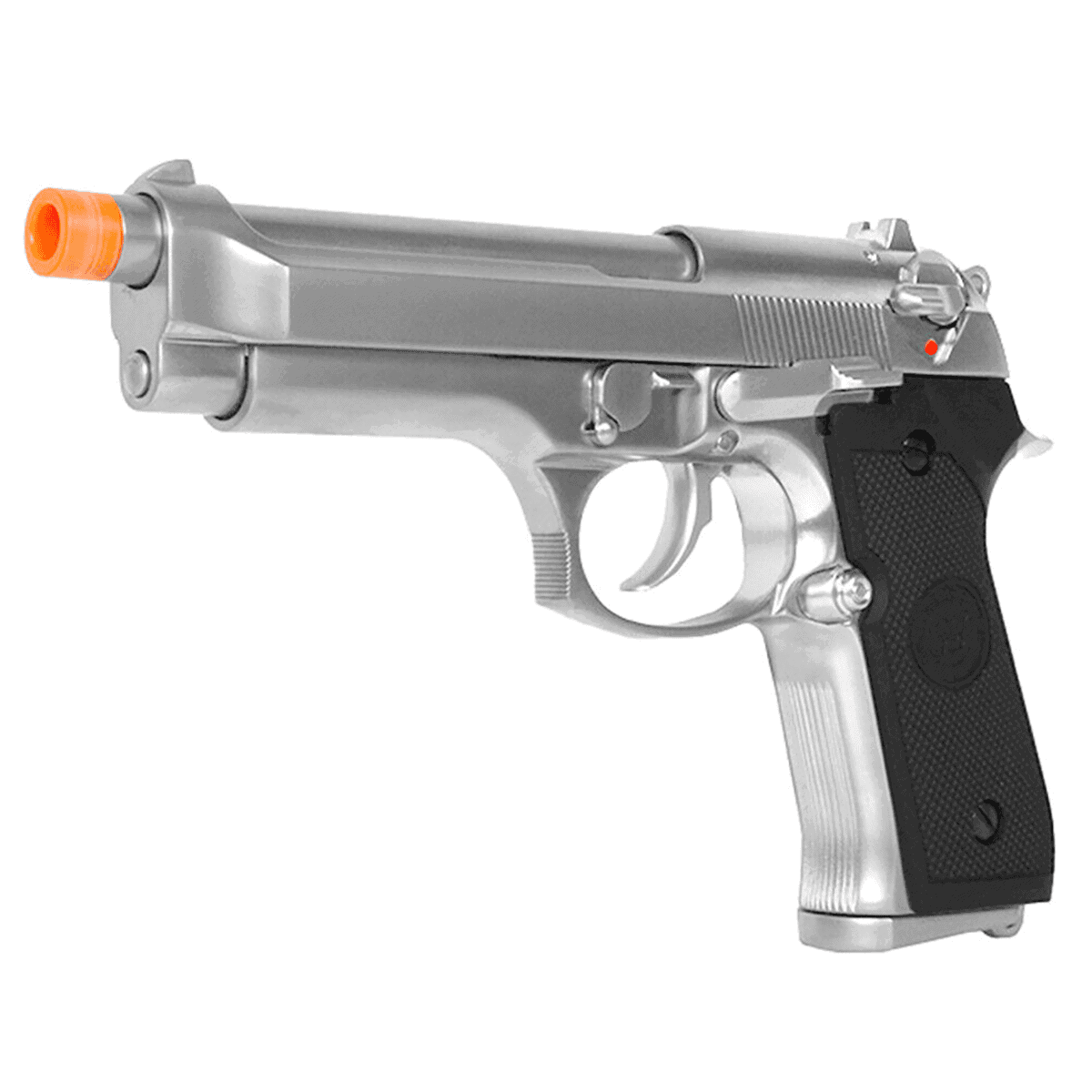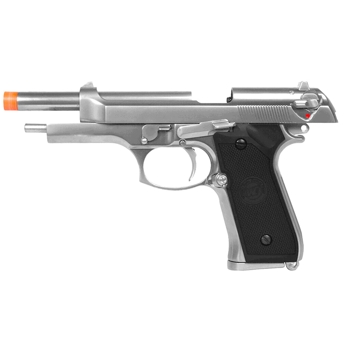 WE 全金屬 M9 重型氣槍專業訓練手槍,設計精良,擁有全金屬鋁合金滑套和槍身,提供極致的耐用性和真實的手感。這款M9重型氣槍具備真實的快速拆解操作,方便維護和清潔,並配有專業格紋握把,提升握持穩定性。滑套保險裝置進一步保證了使用的安全性。