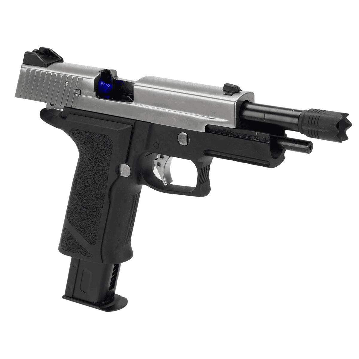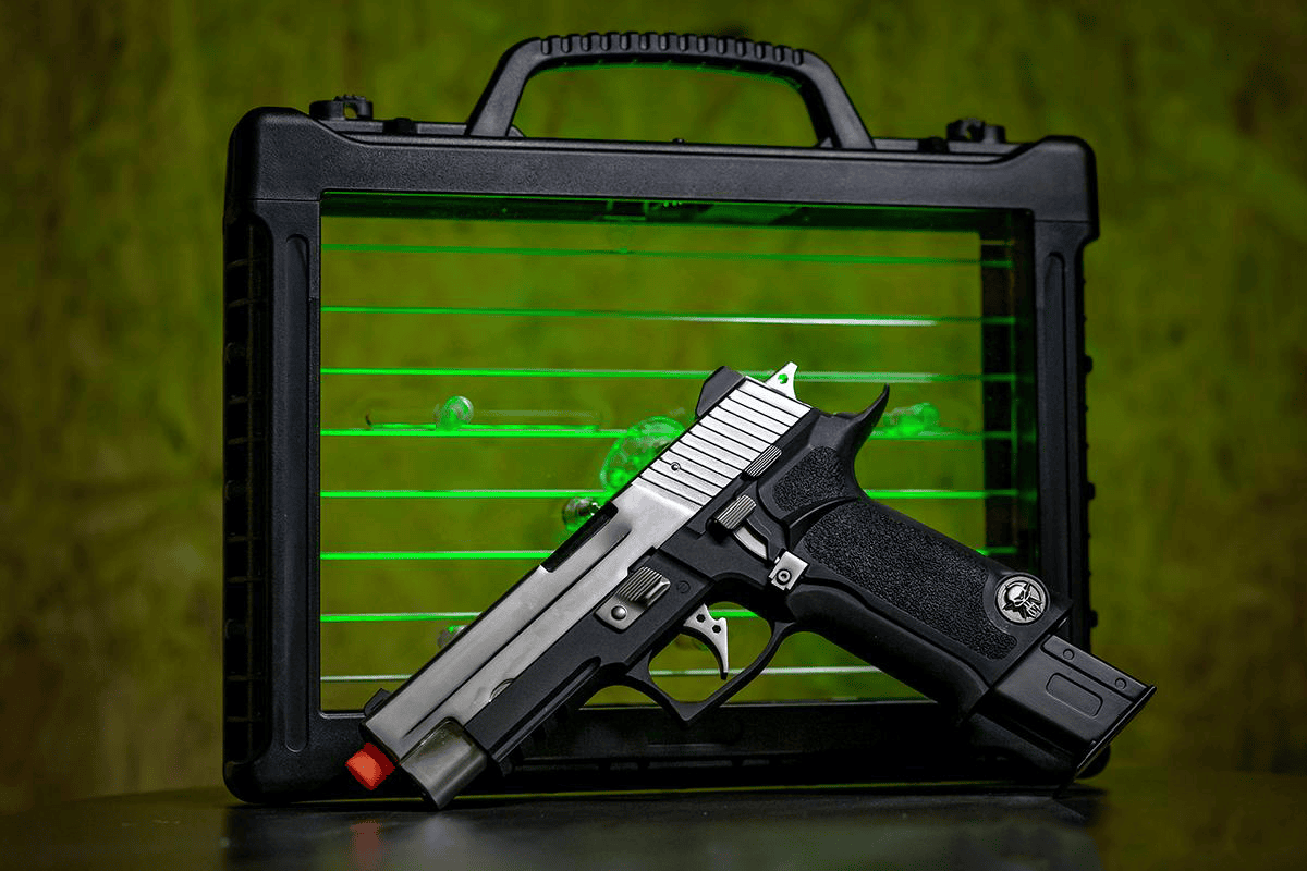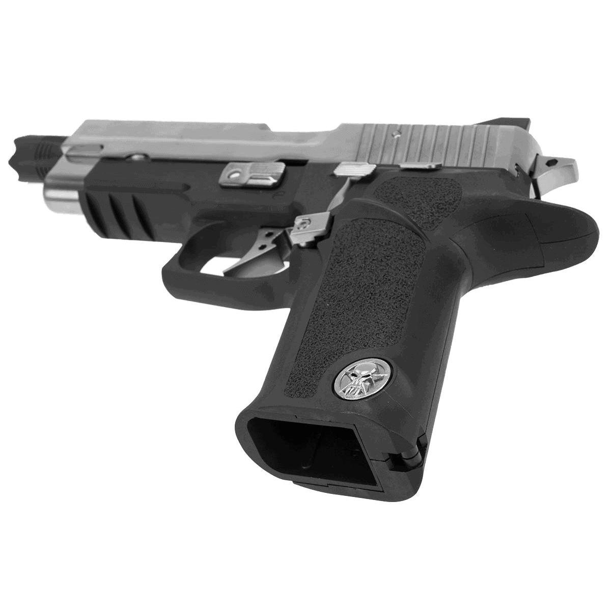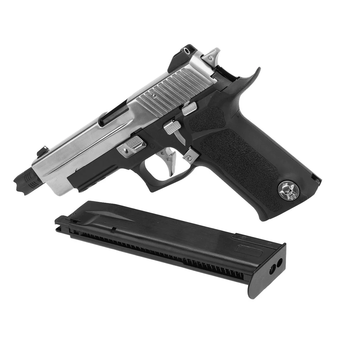 WE 惡靈古堡 P-VIRUS P226 氣槍手槍,採用全鋁合金滑套與下槍身設計,結合增強火控裝置與幽靈環戰鬥風格瞄準器,呈現真實射擊感受。配備20毫米導軌,可安裝戰術手電或其他附件,並附有槍口補償器。改良REAPS式Hopup上旋裝置提高射擊精度,強勁後座力模擬真槍射擊體驗。