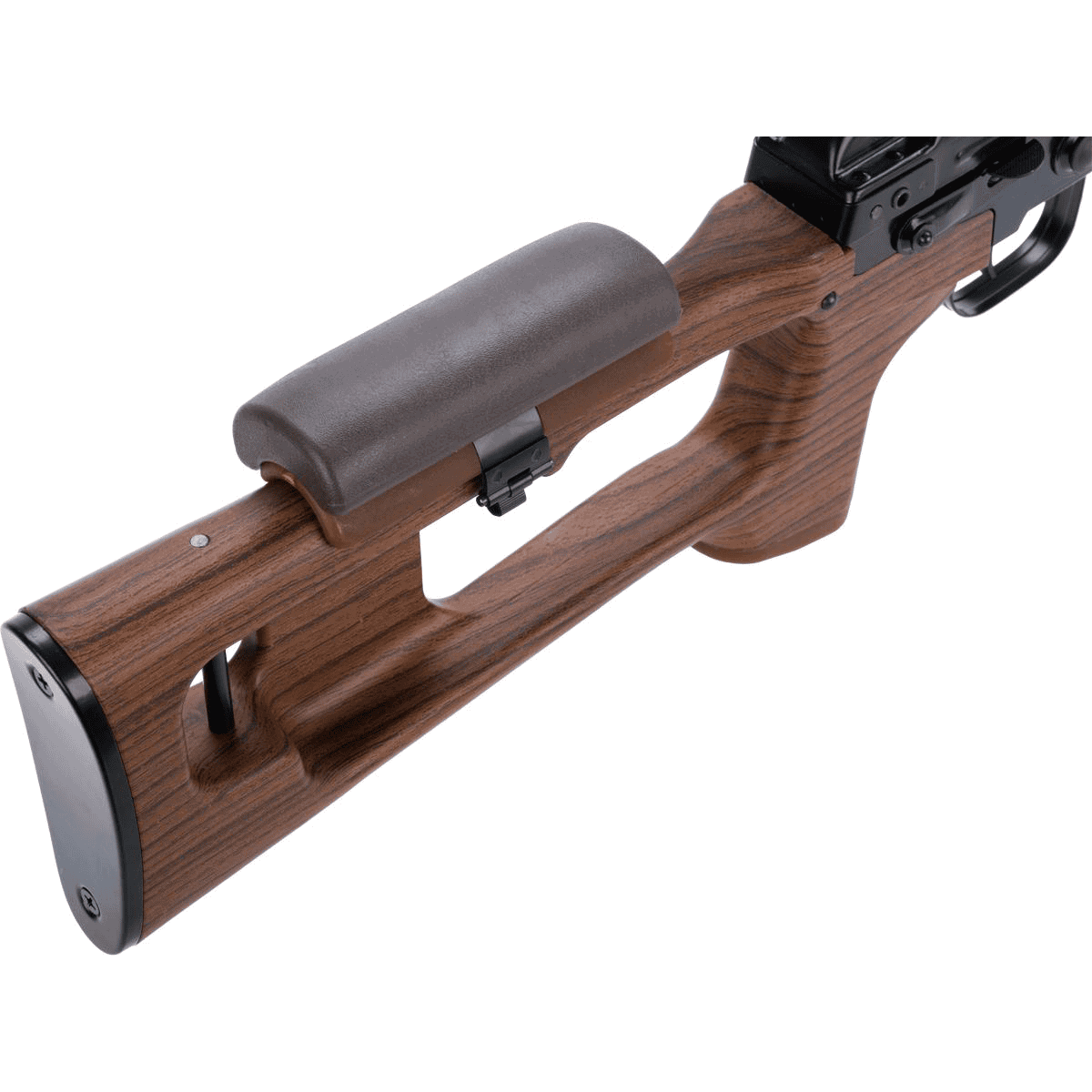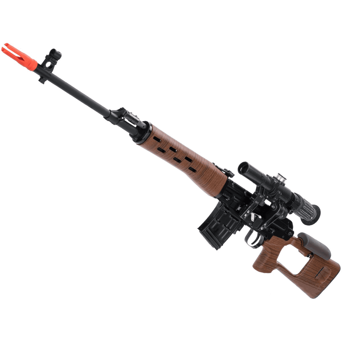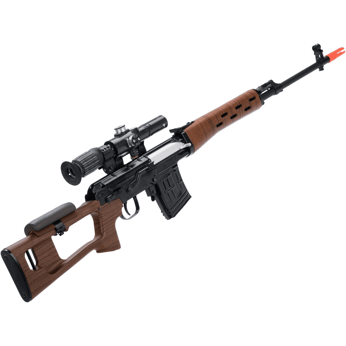 WE SVD 全鋼製氣槍是一款精緻的高性能狙擊步槍,完美複製了蘇聯經典狙擊步槍的外型和手感。這款步槍配備了鋼製機匣與全金屬槍管組件,並且搭配仿木紋設計的塑膠護手,既保留了傳統的外觀,又提高了耐用性。內部採用全金屬活塞和精密組件,確保長時間使用後依然能保持優異的射擊精度。